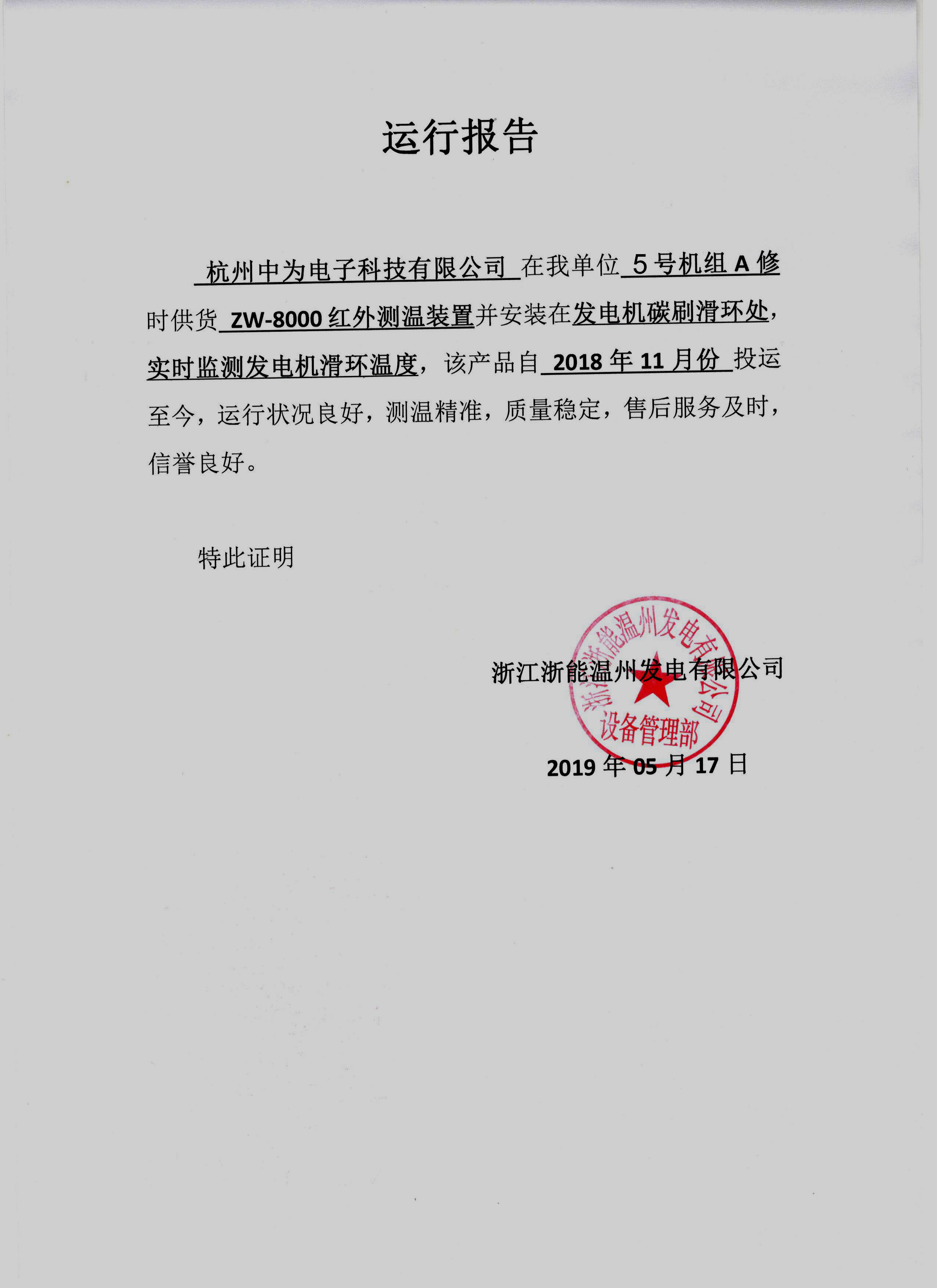 浙江浙能溫州發(fā)電有限公司發(fā)電機滑環(huán)安裝無線紅外測溫裝置