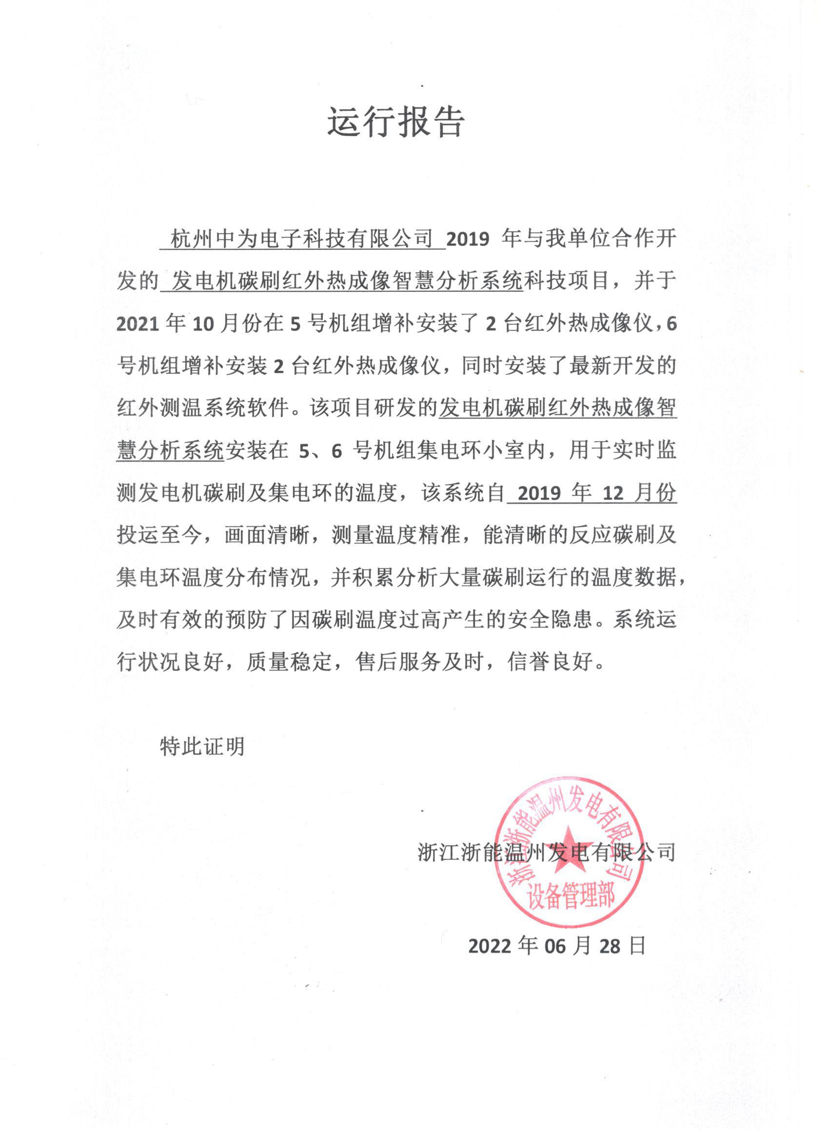 浙江浙能溫州發(fā)電有限公司5、6號(hào)機(jī)組加裝發(fā)電機(jī)碳刷紅外熱成像智慧分析系統(tǒng)