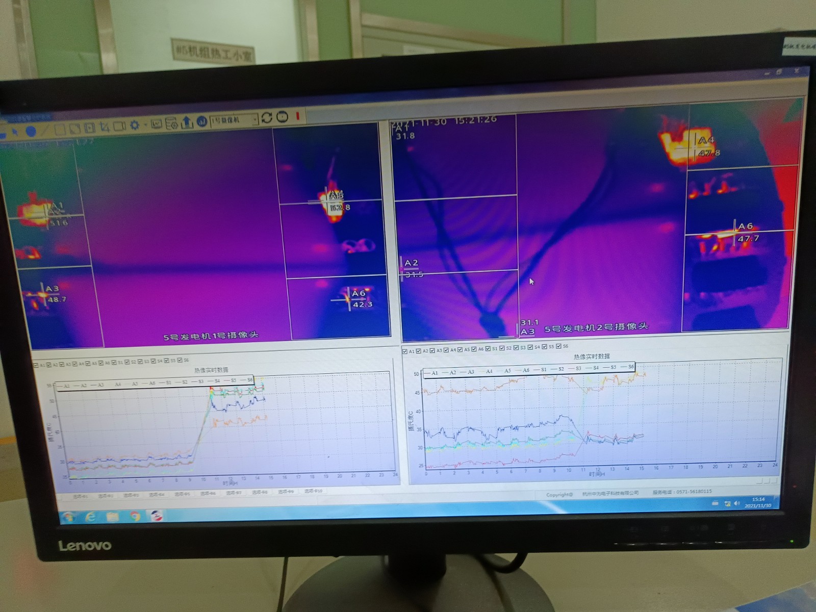 2021年11月,浙江浙能溫州發(fā)電有限公司5、6號(hào)發(fā)電機(jī)合計(jì)完成增補(bǔ)安裝發(fā)電機(jī)碳刷紅外監(jiān)測(cè)熱像儀4套,畫(huà)面清晰穩(wěn)定,溫度監(jiān)控精準(zhǔn);并將現(xiàn)場(chǎng)溫度報(bào)警傳入DCS控制系統(tǒng)中,更好的監(jiān)測(cè)碳刷運(yùn)行情況。