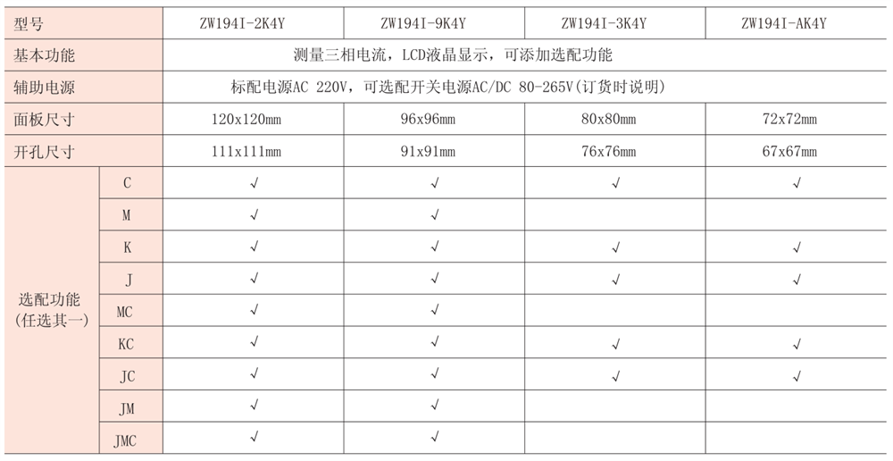 注:“√”代表可選配置,“J”代表報警輸出,“M”代表模擬量輸出,“K”代表開關(guān)量輸入,“C”代表