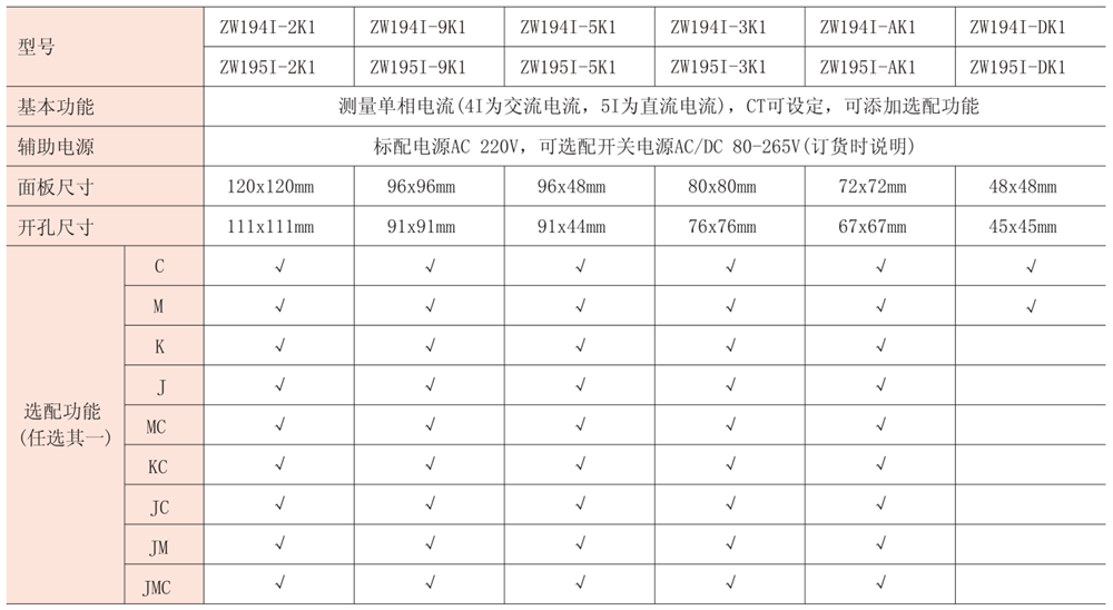 注:“√”代表可選配置,“J”代表報警輸出,“M”代表模擬量輸出,“K”代表開關(guān)量輸入,“C”代表