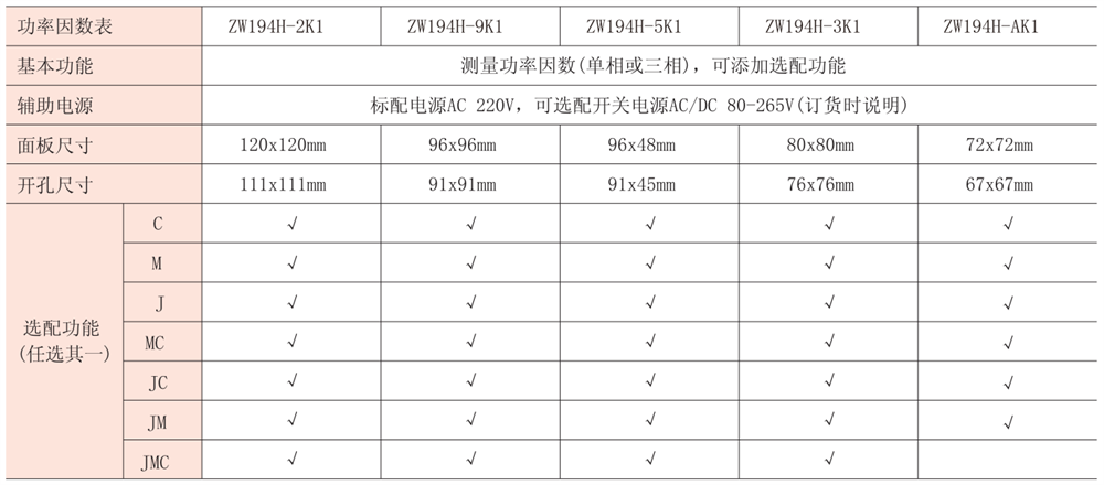 注:“√”代表可選配置,“J”代表報警輸出,“M”代表模擬量輸出,“K”代表開關(guān)量輸入,“C”代表
