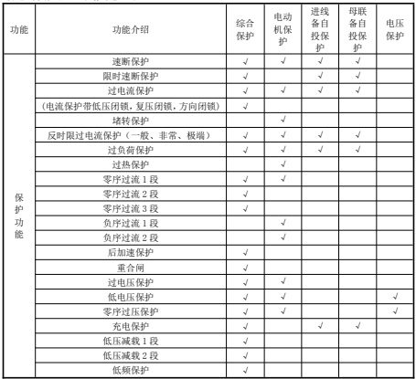 微機(jī)保護(hù)裝置功能配置表: